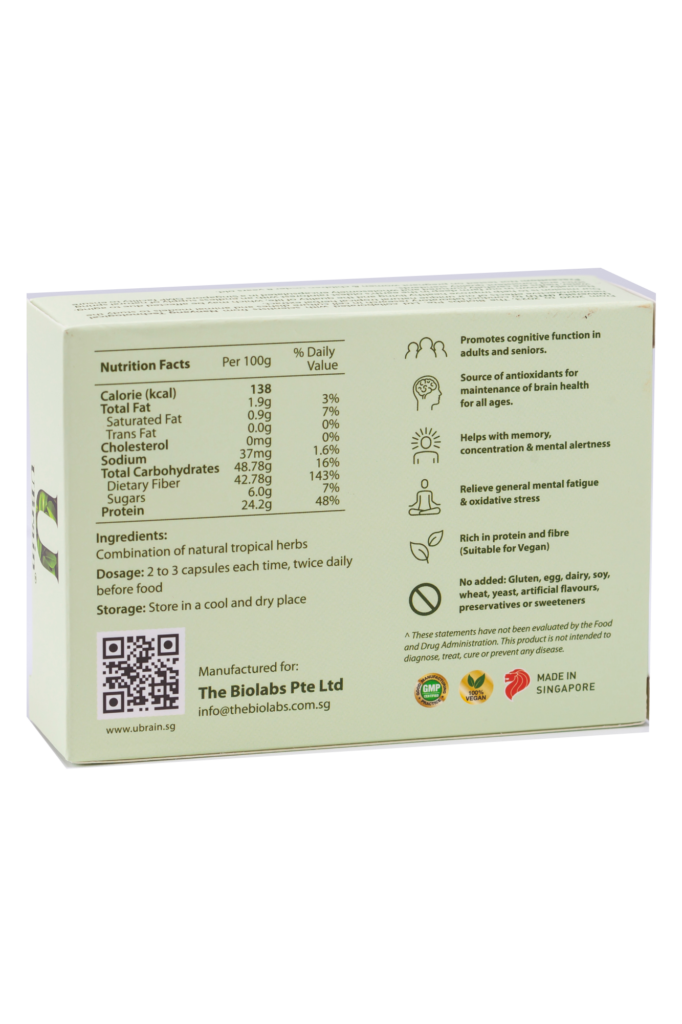 Prevention & maintenance (50 yrs old & above) | 2 capsules before breakfast & 2 capsules before dinner | $98/60 capsules bottle | Leave a gap of 2 hrs between UBrain and other medications | ||||